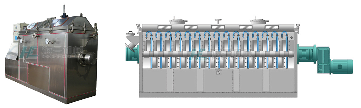 該設備采用全新的結構和工作原理,它們的主要結構如下圖所示。在一個臥式長槽形容器內(nèi)組合排列了很多空心冷卻板片,中心攪拌軸從所有的冷卻板片內(nèi)穿越通過,在每兩個空心冷卻板片之間安裝有阻流式分隔圓盤和很多旋輪推進刮壁式攪拌裝置,刮壁攪拌使所有的冷卻表面都起到清壁作用,使傳熱和冷卻效率大大提高。